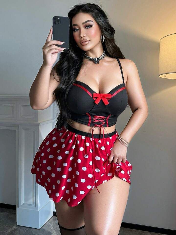 لكل ملكة بتعتز بجمال قوامها، طقم (Two-Piece) بستايل “ميني” الشهير، بيجمع بين اللون الأسود الملكي والأحمر المنقط، مصمم خصيصاً عشان يبرز أنوثتك الطاغية ويديكي ثقة ملهاتش حدود 💖