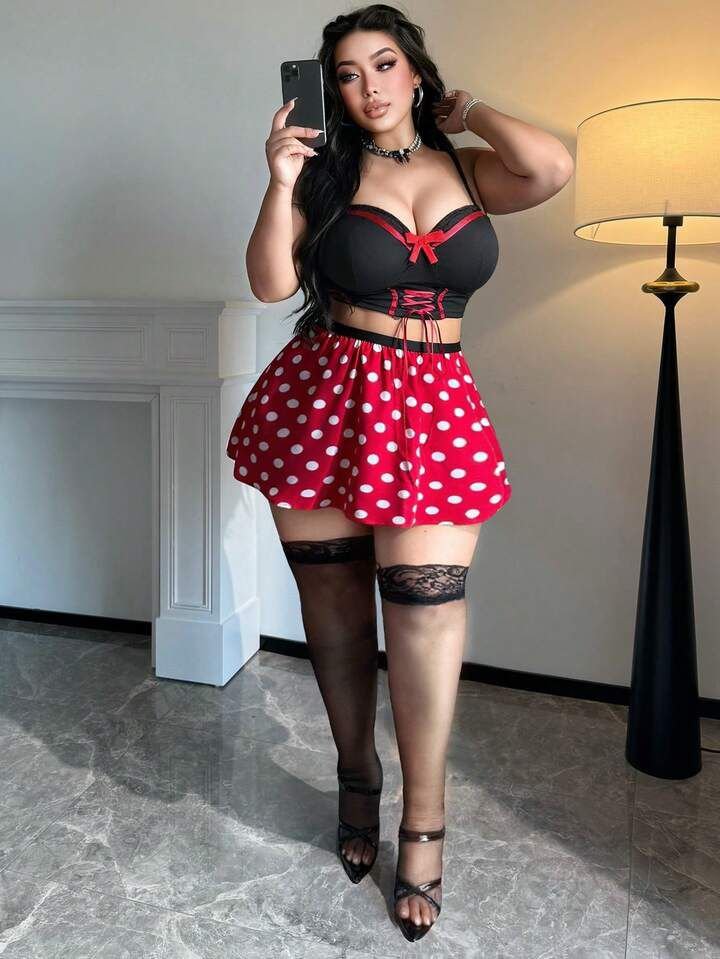 جيبة (Flare Skirt): جيبة حمراء قصيرة بنقشة “بولكا دوت” (منقطة ببيض)، واسعة وبتنفش بجمال عشان تبرز جمال الأرداف وتداري أي منطقة مش حباها.