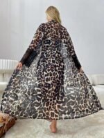 النقشة والتفاصيل: نقشة “جلد النمر” الجذابة بتدرجاتها البنية الدافئة، مدمجة مع دانتيل أسود كلاسيكي عالي الجودة يزين حواف الأكمام ومنطقة الصدر.