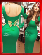 التصميم: قصة “سليم فيت” طويلة بأكمام كاملة، تحدد الجسم بأناقة ورقي باللون الأخضر “الزمردي” الجذاب.